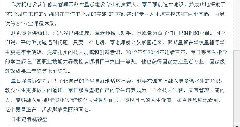柳州日报刊发我院教师覃日强获得全国模范教师的人物专访