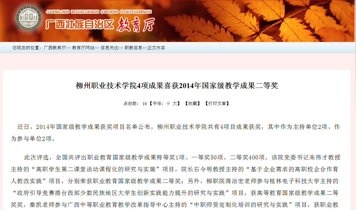 广西教育厅网站发布我院4项成果喜获2014年国家级教学成果二等奖的信息 来源:柳州职业技术学院新闻网 作者:崔智慧 编审: 发布时间:2014-09-26 浏览次数: 次 【字体:小 大】 分享到: 2014年9月26日,广西教育厅网站发布我院4项成果喜获2014年国家级教学成果二等奖的信息。(崔智慧) 信息截图 关闭 打印正文