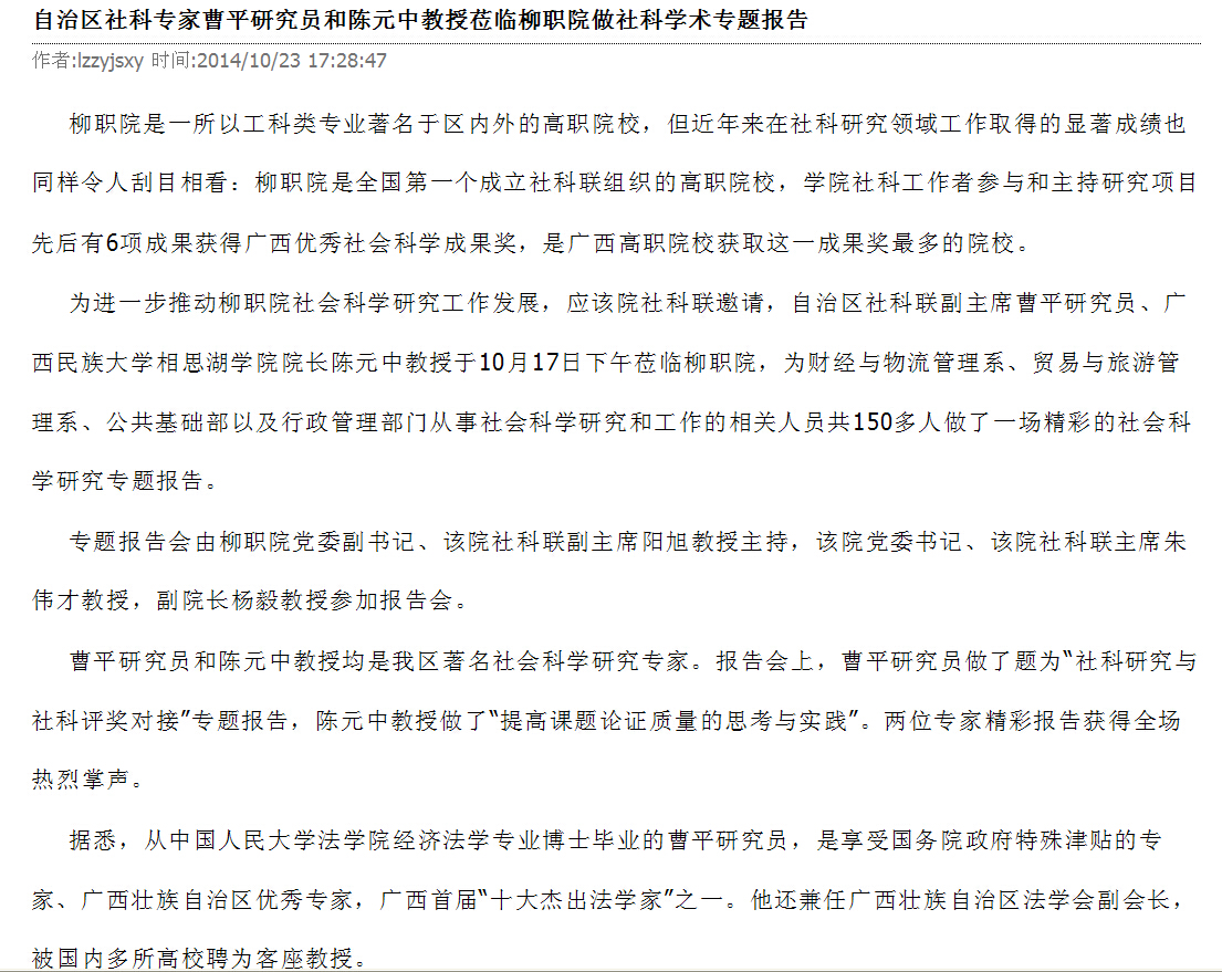 柳州教育局网站发布自治区社科专家到我院作报告的信息 来源:柳州职业技术学院新闻网 作者:崔智慧 编审: 发布时间:2014-10-31 浏览次数: 次 【字体:小 大】 分享到: 10月29日,柳州教育局网站发布自治区社科专家到我院作报告的信息。(崔智慧) 信息截图 关闭 打印正文