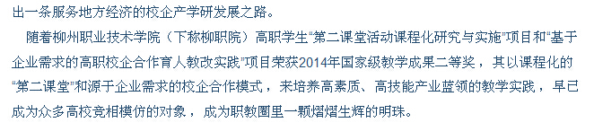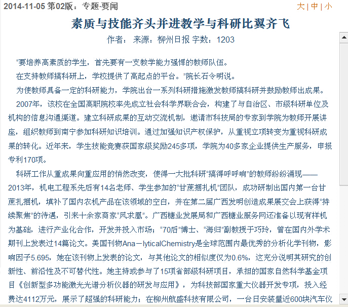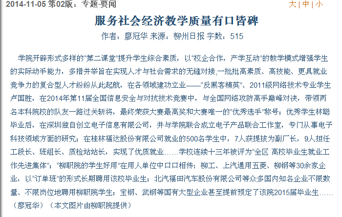 柳州日报刊发我院办学成果的新闻 来源:柳州职业技术学院新闻网 作者:石玉丹 编审: 发布时间:2014-11-05 浏览次数: 次 【字体:小 大】 分享到: 2014年11月5日,柳州日报在第二版,以“人才培养接地气 国家级奖添新花”为题,大篇幅刊发我院办学成果的新闻。(截图:石玉丹) 关闭 打印正文