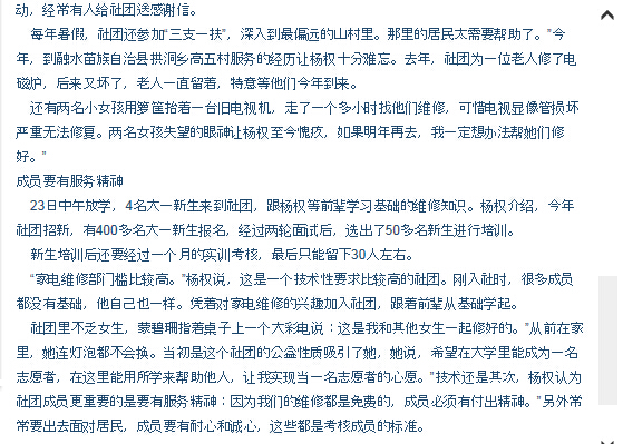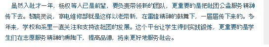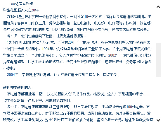柳州晚报刊发我院家电维修部义务服务20年的新闻 来源:柳州职业技术学院新闻网 作者:石玉丹 编审: 发布时间:2014-11-09 浏览次数: 次 【字体:小 大】 分享到: 2014年10月29日,柳州晚报在第11版,以“让公益精神代代传”为题,刊发我院家电维修部义务服务20年的新闻。(截图:石玉丹) 关闭 打印正文
