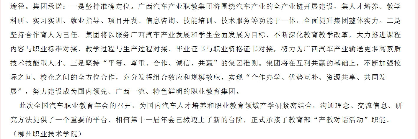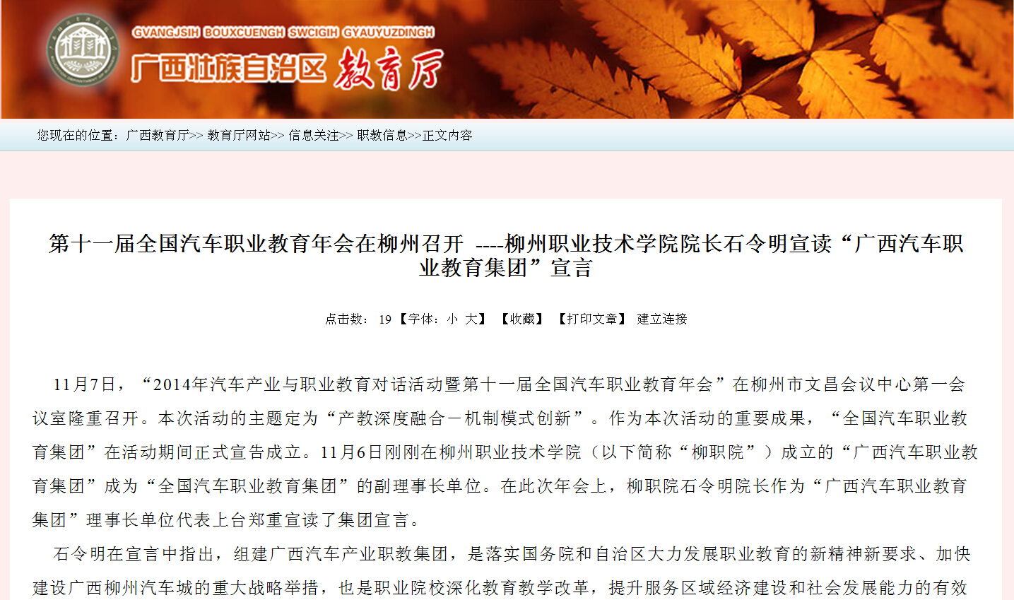 广西教育厅网站发布我院石令明院长在第十一届全国汽车职业教育年会宣读“广西汽车职业教育集团”宣言的信息