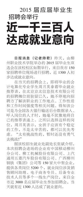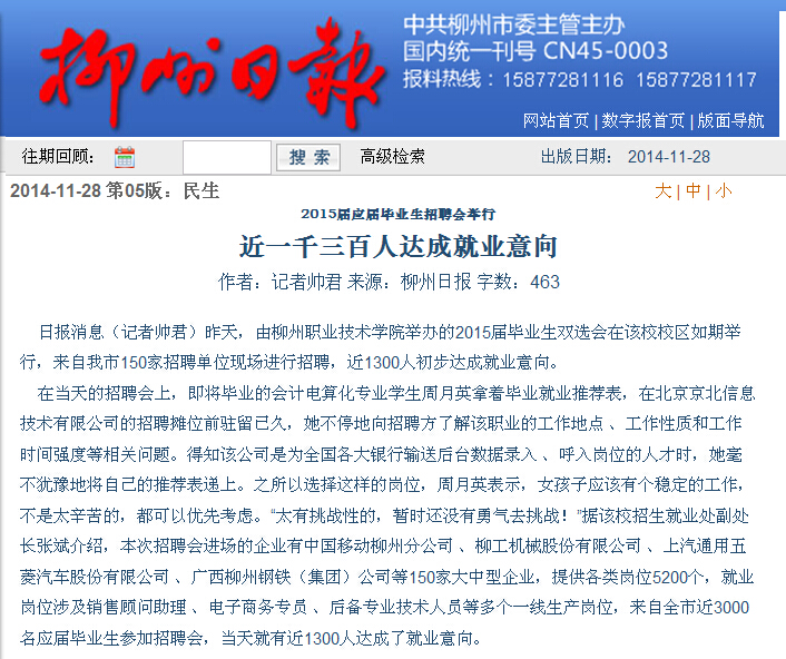 柳州日报刊发我院举行“双选会”的新闻 来源:柳州职业技术学院新闻网 作者:石玉丹 编审: 发布时间:2014-11-28 浏览次数: 次 【字体:小 大】 分享到: 2014年11月28日,柳州日报在第5版,以“近一千三百人达成就业意向”为题,刊发我院举行“双选会”的新闻。(截图:石玉丹) 关闭 打印正文