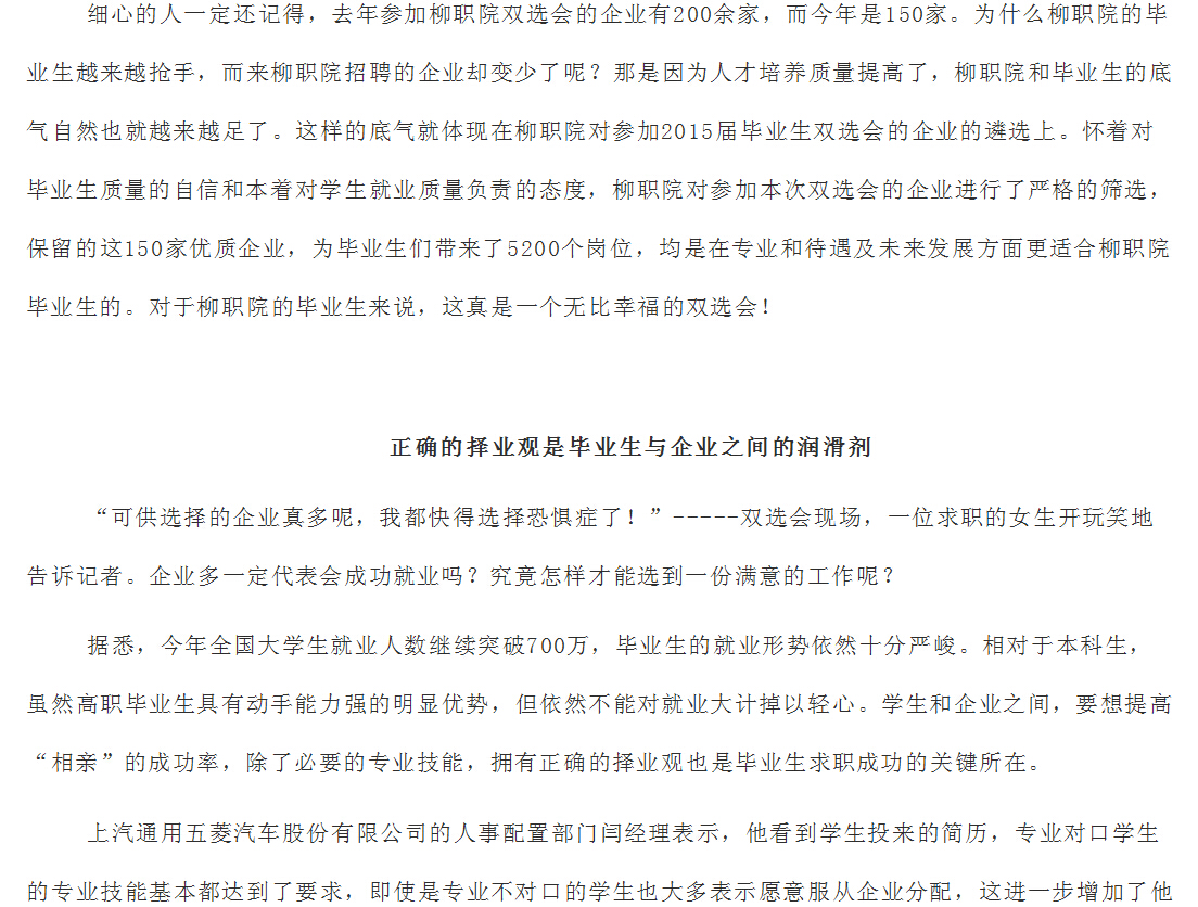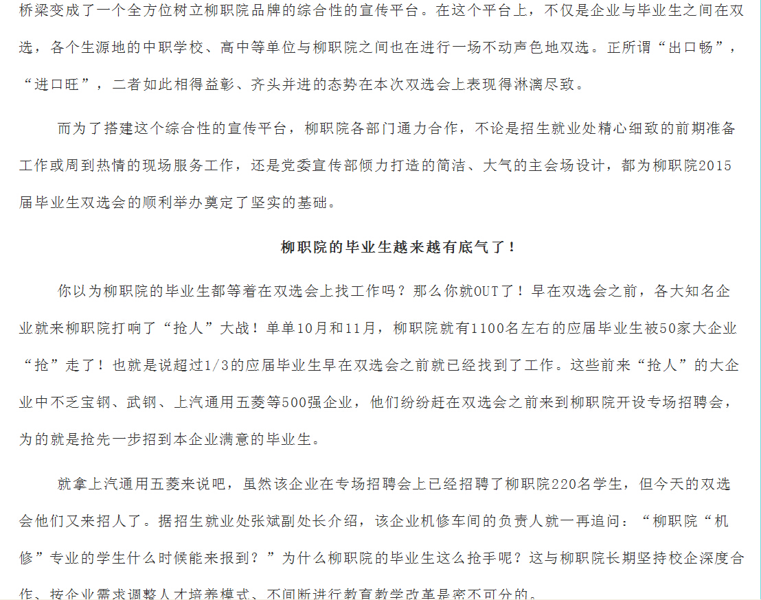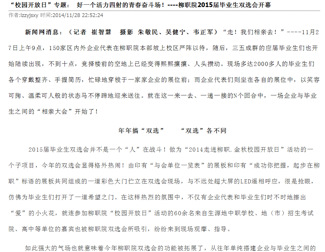 柳州教育局网站发布我院2015届毕业生双选会开幕的信息 来源:柳州职业技术学院新闻网 作者:崔智慧 编审: 发布时间:2014-12-02 浏览次数: 次 【字体:小 大】 分享到: 12月1日,柳州教育局网站发布我院2015届毕业生双选会开幕的信息。(崔智慧) 信息截图 关闭 打印正文