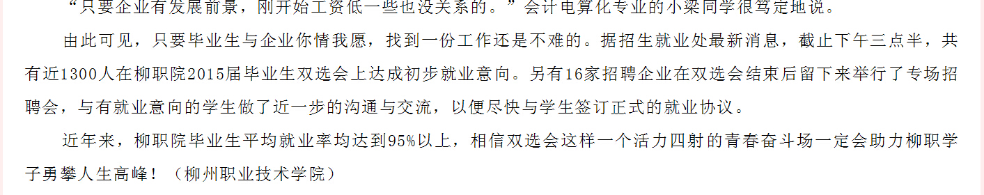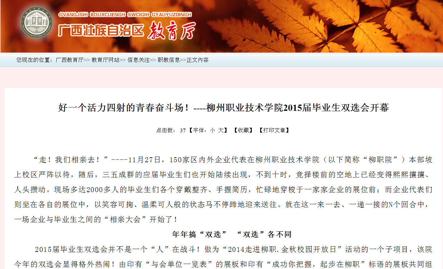 广西教育厅网站发布我院2015届毕业生双选会开幕的信息 来源:柳州职业技术学院新闻网 作者:崔智慧 编审: 发布时间:2014-12-25 浏览次数: 次 【字体:小 大】 分享到: 12月9日,广西教育厅网站发布我院2015届毕业生双选会开幕的信息。(崔智慧) 信息截图 关闭 打印正文
