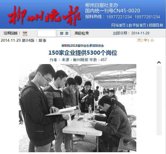柳州晚报刊发我院举办“双选会”的新闻 来源:柳州职业技术学院新闻网 作者:石玉丹 编审: 发布时间:2015-01-04 浏览次数: 次 【字体:小 大】 分享到: 2014年11月29日,柳州晚报在第4版以“150家企业提供5300个岗位”为题,刊发我院举办“双选会”的新闻。(截图:石玉丹) 关闭 打印正文