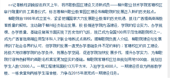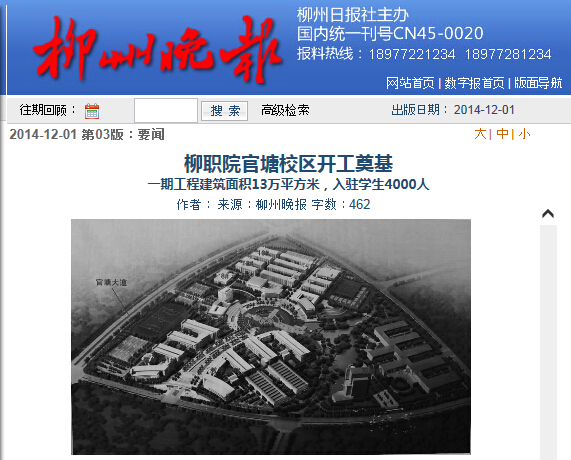 柳州晚报刊发我院新校区举行奠基仪式的新闻 来源:柳州职业技术学院新闻网 作者:石玉丹 编审: 发布时间:2015-01-04 浏览次数: 次 【字体:小 大】 分享到: 2014年12月1日,柳州晚报在第3版,以“柳职院官塘校区开工奠基”为题,刊发我院新校区举行开工仪式的新闻。(截图:石玉丹) 关闭 打印正文