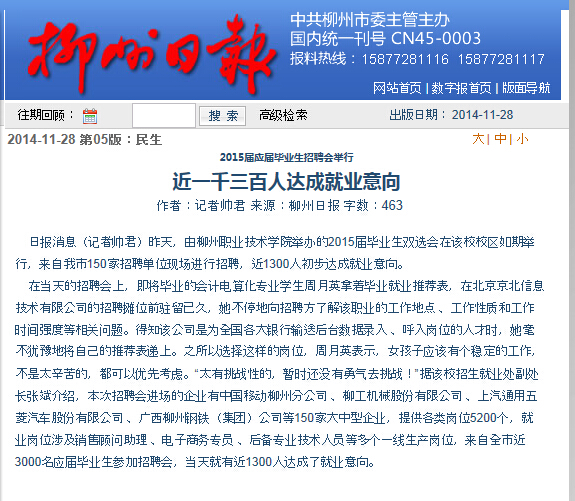 柳州日报刊发我院举办“双选会”的新闻 来源:柳州职业技术学院新闻网 作者:石玉丹 编审: 发布时间:2015-01-04 浏览次数: 次 【字体:小 大】 分享到: 2014年11月28日,柳州日报在第5版,以“近一千三百人达成就业意向”为题,刊发我院举办“双选会”的消息。(截图:石玉丹) 关闭 打印正文