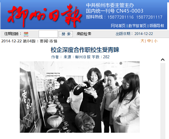柳州日报刊发我院学生受企业青睐的新闻 来源:柳州职业技术学院新闻网 作者:石玉丹 编审: 发布时间:2015-01-05 浏览次数: 次 【字体:小 大】 分享到: 2014年12月22日,柳州日报在第4版,以“校企深度交融,职校生受青睐”为题,刊发我院举办第四届企业活动开放周暨毕业展系列活动的新闻。(截图:石玉丹) 关闭 打印正文