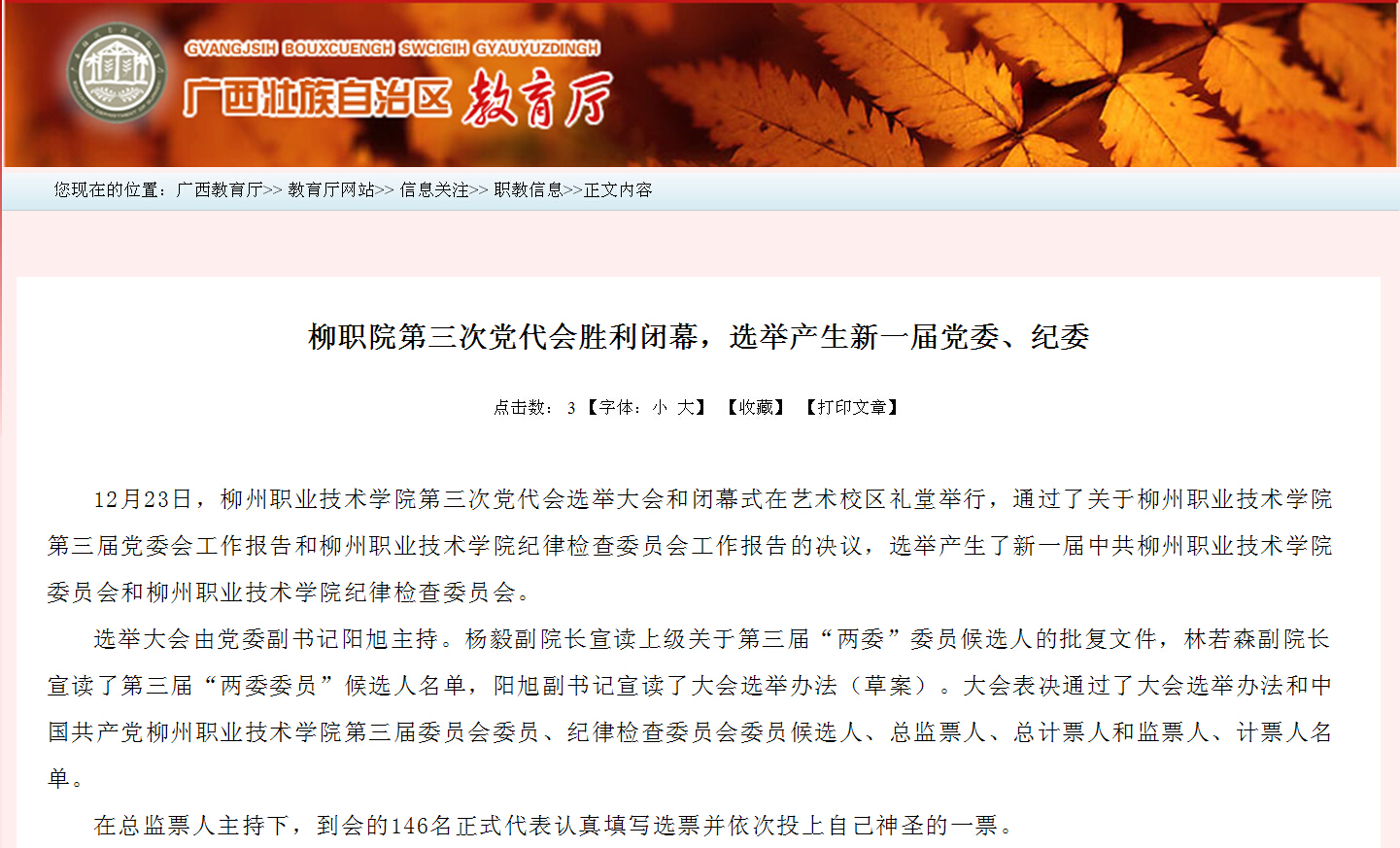 广西教育厅网站发布我院第三次党代会胜利闭幕的信息 来源:柳州职业技术学院新闻网 作者:崔智慧 编审: 发布时间:2015-01-09 浏览次数: 次 【字体:小 大】 分享到: 2015年1月9日,广西教育厅网站发布我院第三次党代会胜利闭幕的信息。(崔智慧) 信息截图 关闭 打印正文