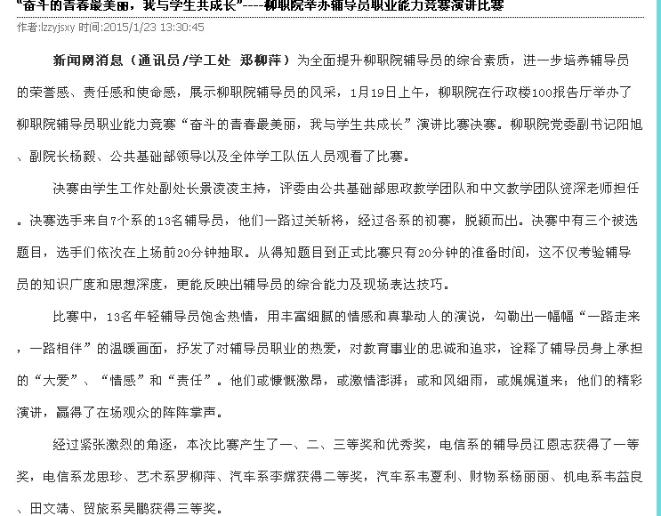 柳州教育局网站发布我院举办辅导员职业能力竞赛演讲比赛的信息 来源:柳州职业技术学院新闻网 作者:崔智慧 编审: 发布时间:2015-03-05 浏览次数: 次 【字体:小 大】 分享到: 2015年1月22日,柳州教育局网站发布我院举办辅导员职业能力竞赛演讲比赛的信息。(崔智慧) 信息截图 关闭 打印正文