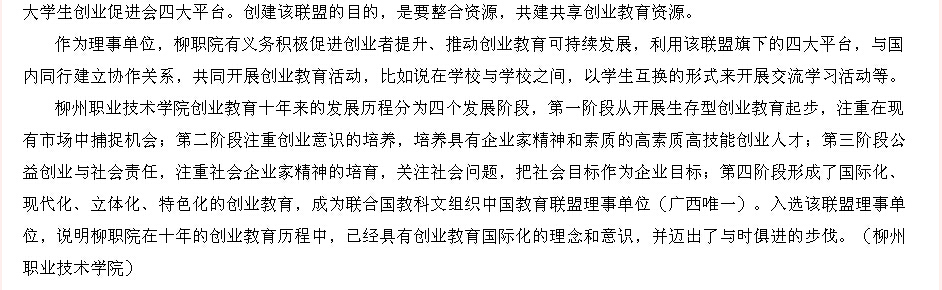 广西教育厅网站发布学院入选联合国教科文组织中国创业教育联盟理事单位的信息 来源:柳州职业技术学院新闻网 作者:崔智慧 编审: 发布时间:2015-03-05 浏览次数: 次 【字体:小 大】 分享到: 2015年1月20日,广西教育厅网站发布学院入选联合国教科文组织中国创业教育联盟理事单位的信息。(崔智慧) 信息截图 关闭 打印正文