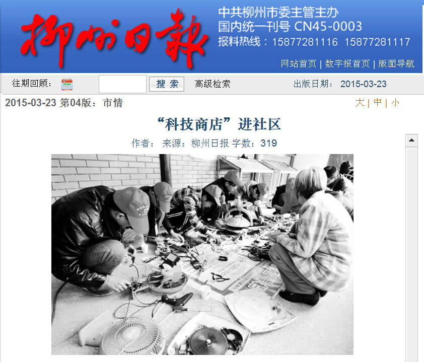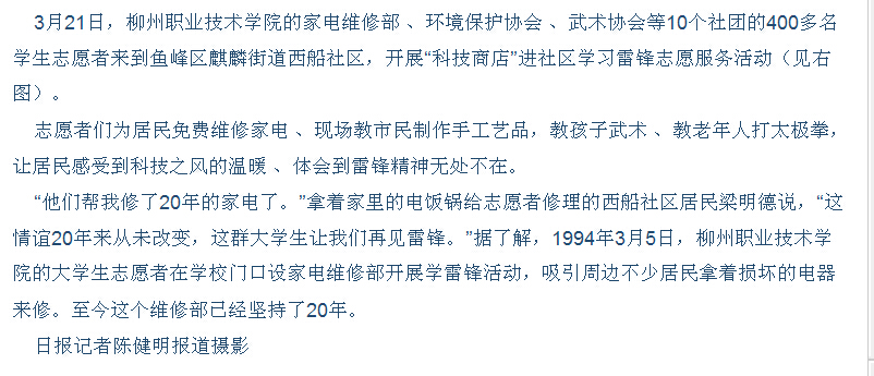 柳州日报近日刊发我院大学生开展学雷锋志愿者活动的新闻 来源:柳州职业技术学院新闻网 作者:石玉丹 编审: 发布时间:2015-03-25 浏览次数: 次 【字体:小 大】 分享到: 2015年3月23日,柳州日报在第四版,以“‘科技商店’进社区”为题,刊发我院大学生开展学雷锋志愿者活动的新闻。(载图:石玉丹) 关闭 打印正文