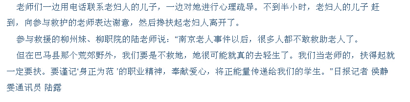 柳州日报近日刊发有我院老师参加的一次学雷锋救援行动 来源:柳州职业技术学院新闻网 作者:石玉丹 编审: 发布时间:2015-03-25 浏览次数: 次 【字体:小 大】 分享到: 2015年3月25日,柳州日报在第五版,以“扶得起就一定要扶”为题,刊发有我院老师参加的一次学雷锋救援行动。(截图:石玉丹) 关闭 打印正文