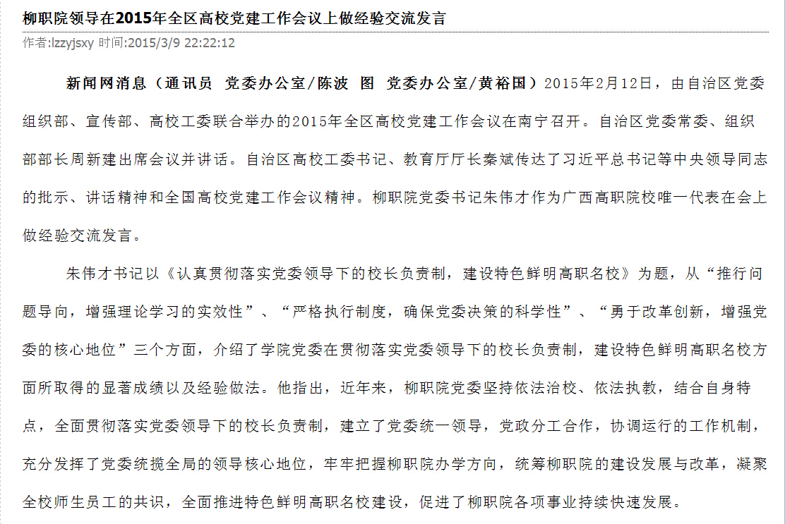 柳州教育局网站发布我院领导在2015年全区高校党建工作会议上做经验交流发言的信息 来源:柳州职业技术学院新闻网 作者:崔智慧 编审: 发布时间:2015-03-26 浏览次数: 次 【字体:小 大】 分享到: 2015年3月11日,柳州教育局网站发布我院领导在2015年全区高校党建工作会议上做经验交流发言的信息。(崔智慧) 信息截图 关闭 打印正文
