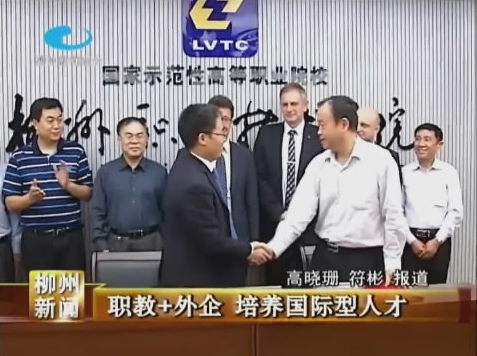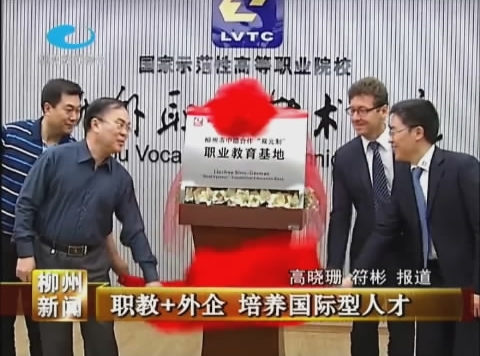 2015年4月3日,柳州电视台《柳州新闻》栏目播出我院与柳州采埃孚机械有限公司举行“德国双元制”职业教育合作签约及揭牌仪式的新闻。(新闻截图/朱敬民)