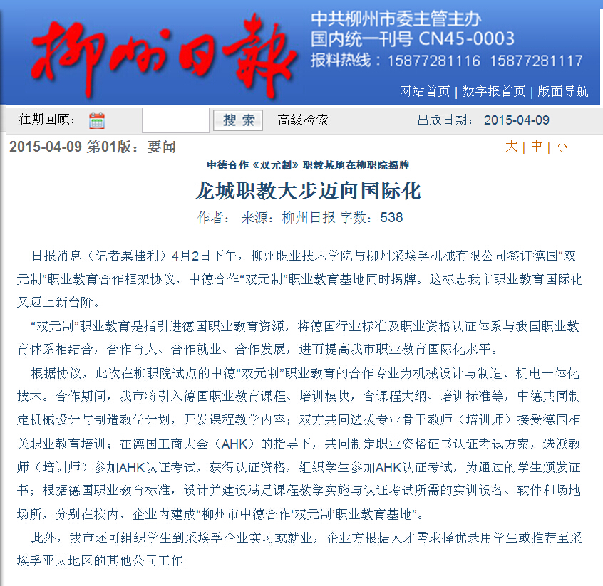 柳州日报近日刊发我院试点德国双元制办学模式的新闻 来源:柳州职业技术学院新闻网 作者:石玉丹 编审: 发布时间:2015-04-10 浏览次数: 次 【字体:小 大】 分享到: 2015年4月9日,柳州日报在头版以“龙城职教大步迈向国际化”为题,刊发我院试点德国双元制办学模式的新闻。(截图:石玉丹) 关闭 打印正文