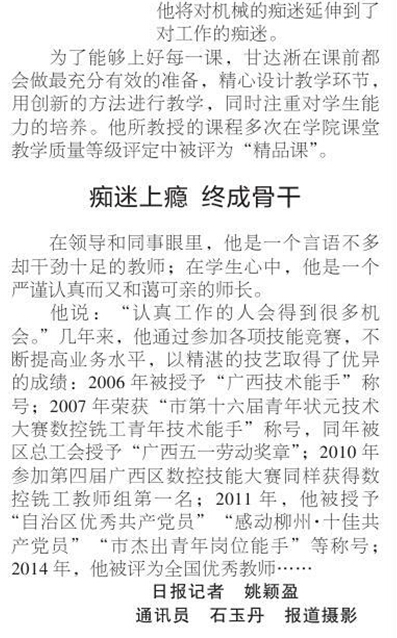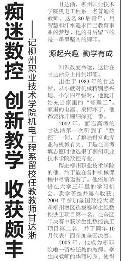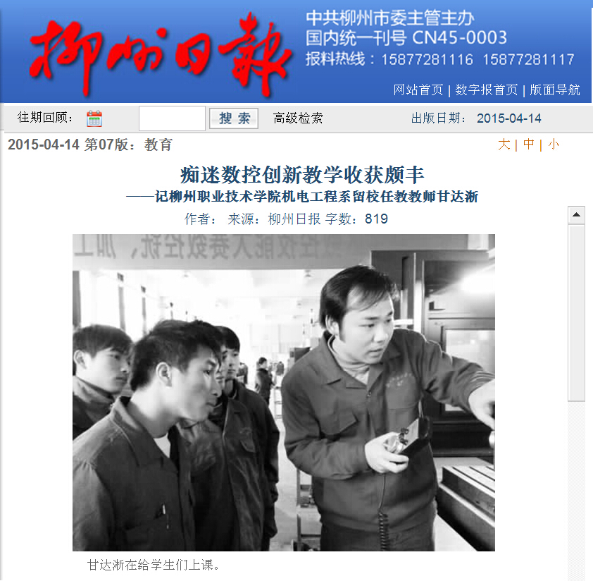 柳州日报近日刊发我院教师在教育工作上创新教学的新闻 来源:柳州职业技术学院新闻网 作者:石玉丹 编审: 发布时间:2015-04-29 浏览次数: 次 【字体:小 大】 分享到: 2015年4月14日,柳州日报在第7版,以“痴迷数控创新教学收获颇丰”为题,刊发我院教师甘达淅在教育工作上创新教学的新闻。(截图:石玉丹) 关闭 打印正文