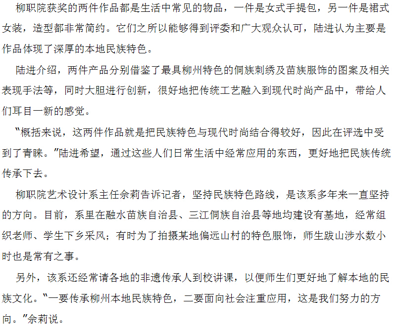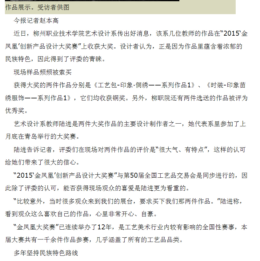 南国今报近日刊发我院艺术系老师获全国设计大奖的新闻 来源:柳州职业技术学院新闻网 作者:石玉丹 编审: 发布时间:2015-04-29 浏览次数: 次 【字体:小 大】 分享到: 2015年4月20日,南国今报在第5版,以“苗侗元素融入时尚,收获全国设计大奖”为题,刊发我院艺术系几位老师获得全国大奖的新闻。(截图:石玉丹) 关闭 打印正文