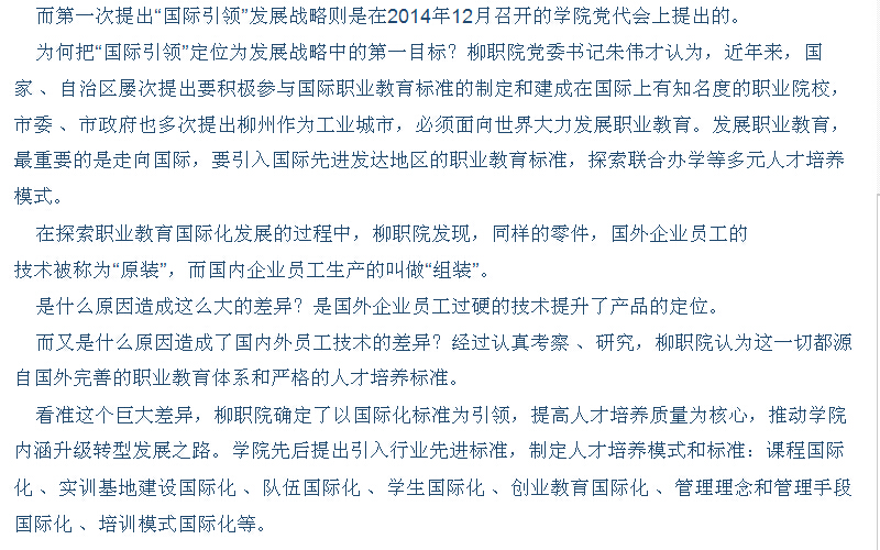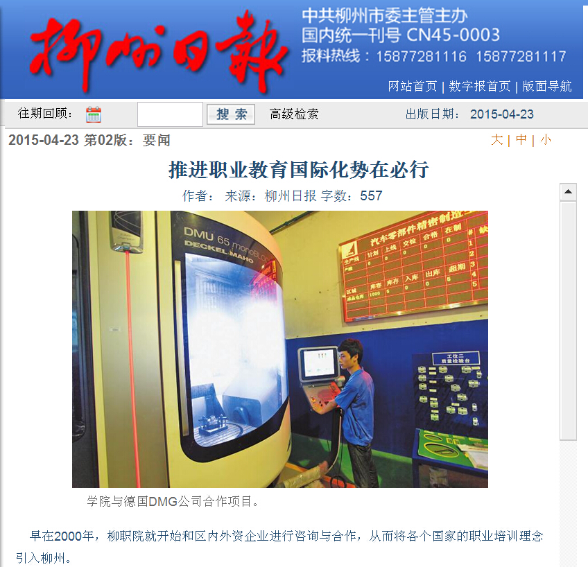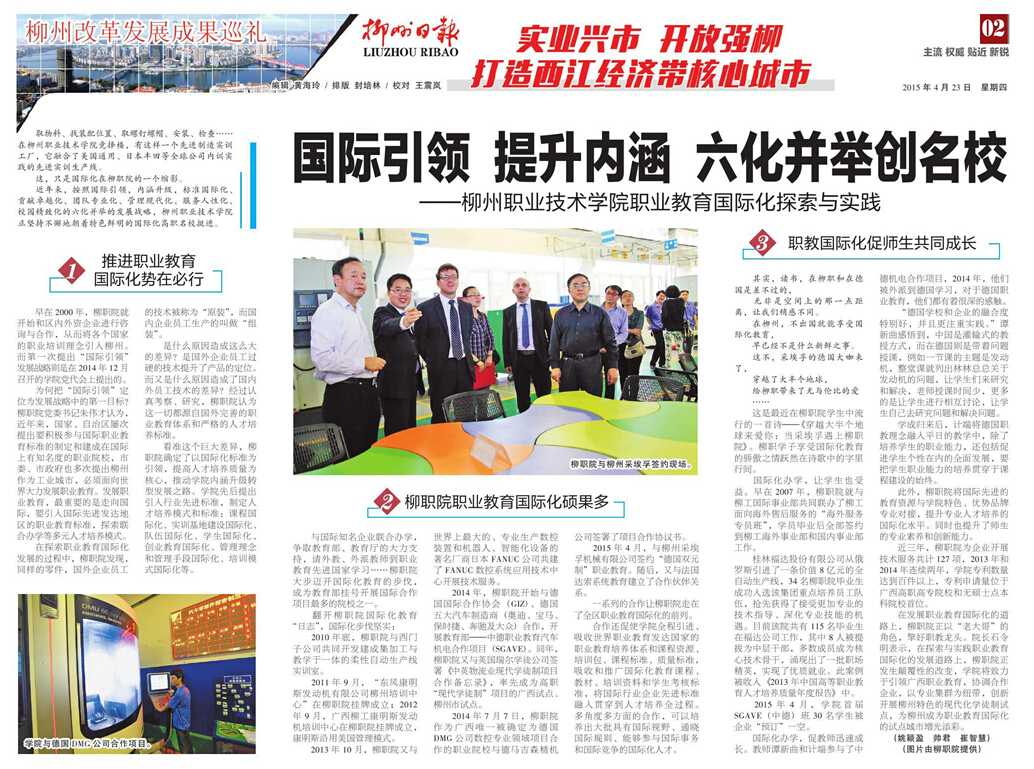 柳州日报近日刊发我院国际化办学的成就性报道 来源:柳州职业技术学院新闻网 作者:石玉丹 编审: 发布时间:2015-04-29 浏览次数: 次 【字体:小 大】 分享到: 2015年4月23日,柳州日报在第2版,以“国际引领,提升内涵,六化并举创名?!蔽?,大篇幅刊发我院国际化办学的成就性新闻。(截图:石玉丹) 关闭 打印正文