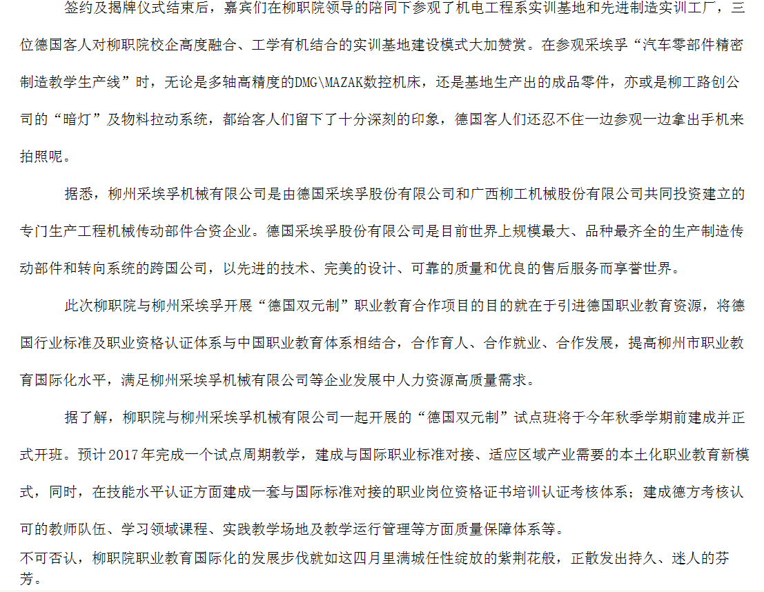 柳州教育局网站发布“德国双元制”职业教育合作签约及揭牌仪式在我院举行的信息 来源:柳州职业技术学院新闻网 作者:崔智慧 编审: 发布时间:2015-05-04 浏览次数: 次 【字体:小 大】 分享到: 2015年4月7日,柳州教育局网站发布“德国双元制”职业教育合作签约及揭牌仪式在我院举行的信息。(崔智慧) 关闭 打印正文
