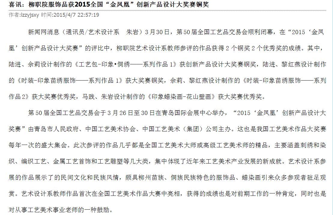 柳州教育局网站发布我院服饰品获2015全国“金凤凰”创新产品设计大奖赛铜奖的信息 来源:柳州职业技术学院新闻网 作者:崔智慧 编审: 发布时间:2015-05-04 浏览次数: 次 【字体:小 大】 分享到: 2015年4月7日,柳州教育局网站发布我院服饰品获2015全国“金凤凰”创新产品设计大奖赛铜奖的信息。(崔智慧) 关闭 打印正文
