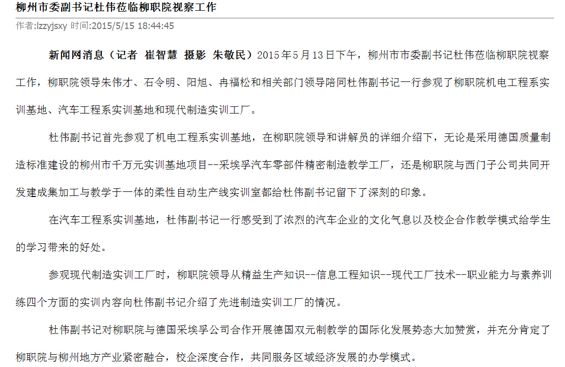 柳州教育局网站发布柳州市委副书记杜伟到我院视察工作的信息 来源:柳州职业技术学院新闻网 作者:崔智慧 编审: 发布时间:2015-05-27 浏览次数: 次 【字体:小 大】 分享到: 2015年5月19日,柳州教育局网站发布柳州市委副书记杜伟到我院视察工作的信息。(崔智慧) 关闭 打印正文