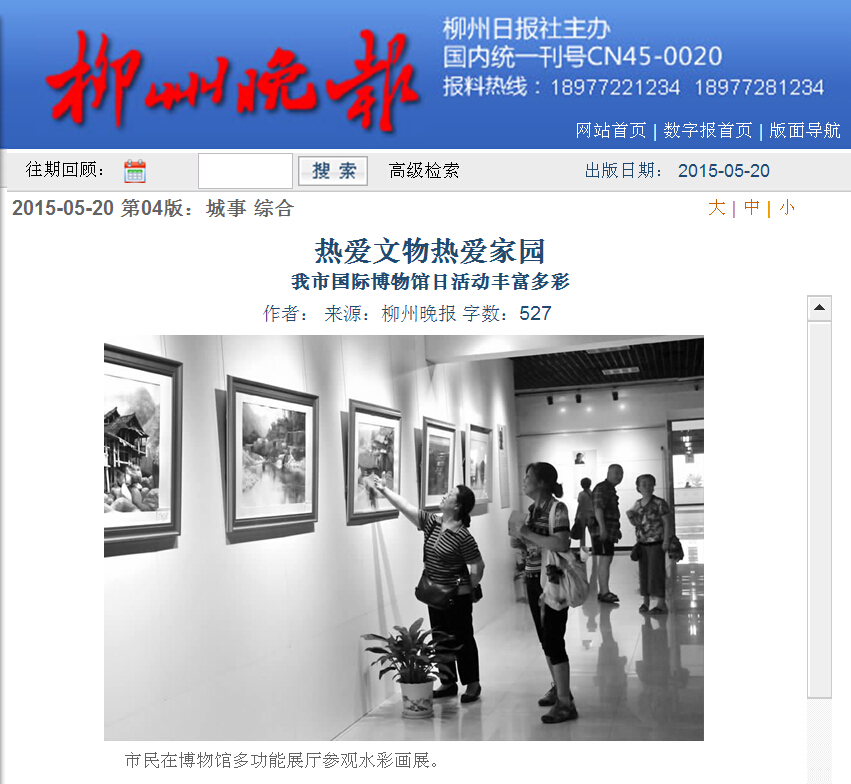 柳州晚报刊发我院在柳州工业博物馆实践教学基地揭牌的新闻 来源:柳州职业技术学院新闻网 作者:石玉丹 编审: 发布时间:2015-05-29 浏览次数: 次 【字体:小 大】 分享到: 2015年5月20日,柳州晚报在第4版,以“热爱文物,热爱家园”为题,刊发我院在柳州工业博物馆实践教学基地揭牌的新闻。(截图:石玉丹) 关闭 打印正文