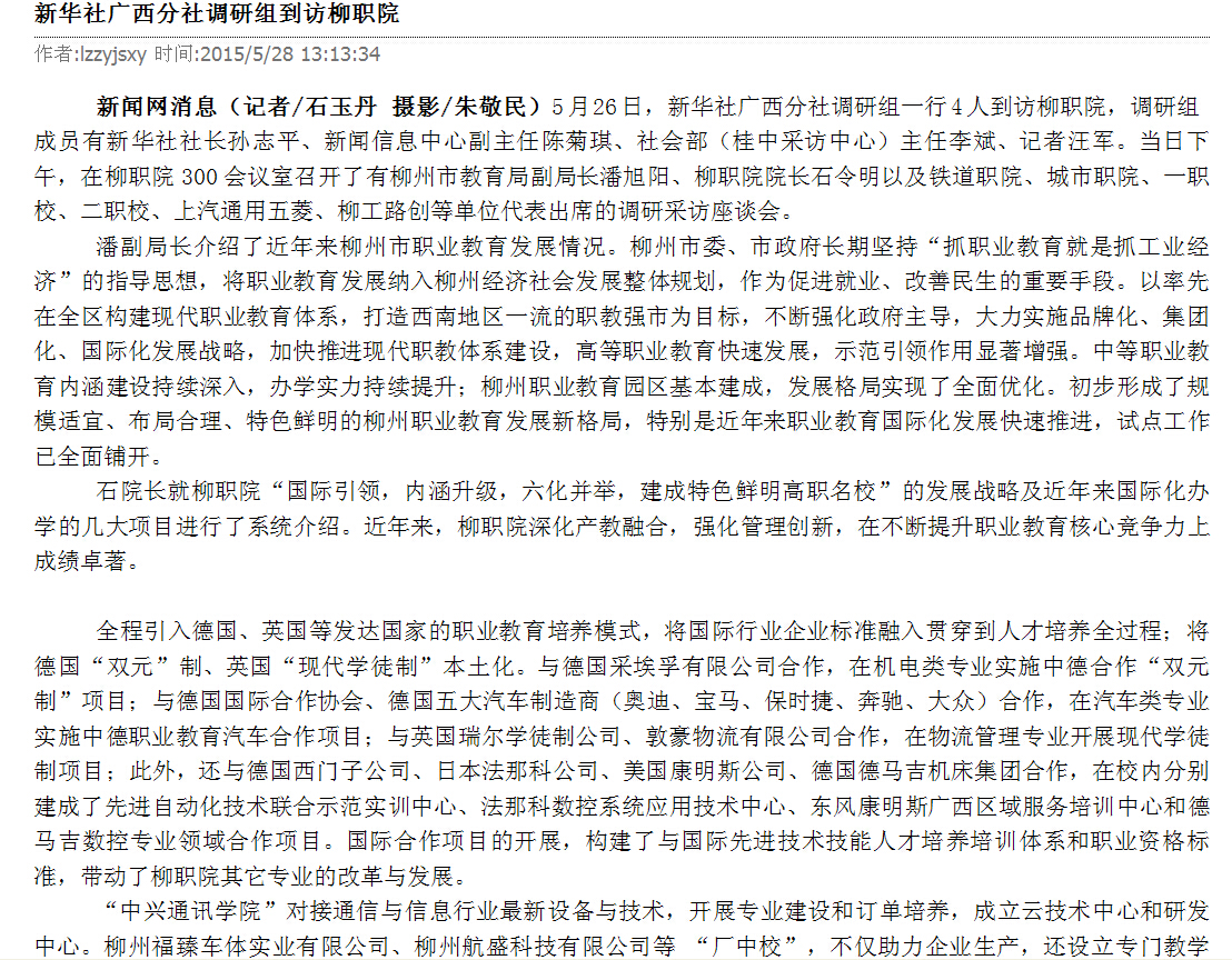 柳州教育局网站发布新华社广西分社调研组到访我院的信息 来源:柳州职业技术学院新闻网 作者:崔智慧 编审: 发布时间:2015-07-08 浏览次数: 次 【字体:小 大】 分享到: 5月29日,柳州教育局网站发布新华社广西分社调研组到访我院的信息。(崔智慧) 关闭 打印正文
