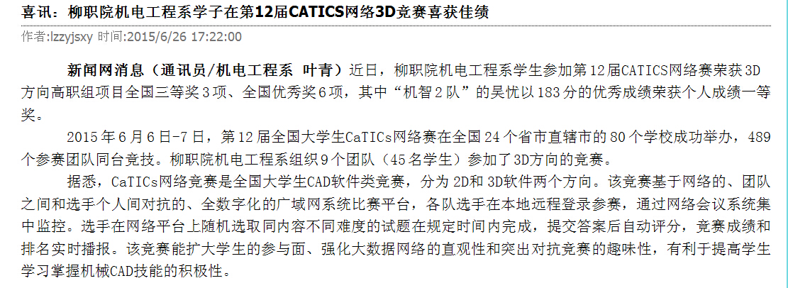 柳州教育局网站发布我院机电工程系学子在第12届CATICS网络3D竞赛喜获佳绩的信息 来源:柳州职业技术学院新闻网 作者:崔智慧 编审: 发布时间:2015-07-08 浏览次数: 次 【字体:小 大】 分享到: 6月30日,柳州教育局网站发布我院机电工程系学子在第12届CATICS网络3D竞赛喜获佳绩的信息。(崔智慧) 关闭 打印正文