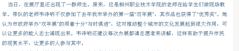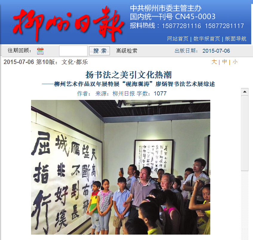柳州日报刊发我院师生参加柳州市书法艺术展的新闻 来源:柳州职业技术学院新闻网 作者:石玉丹 编审: 发布时间:2015-07-13 浏览次数: 次 【字体:小 大】 分享到: 2015年7月6日,柳州日报在第10版以“扬书法之美引文化热潮”为题,刊发我院师生参加柳州市书法艺术展的新闻。(截图:石玉丹) 关闭 打印正文