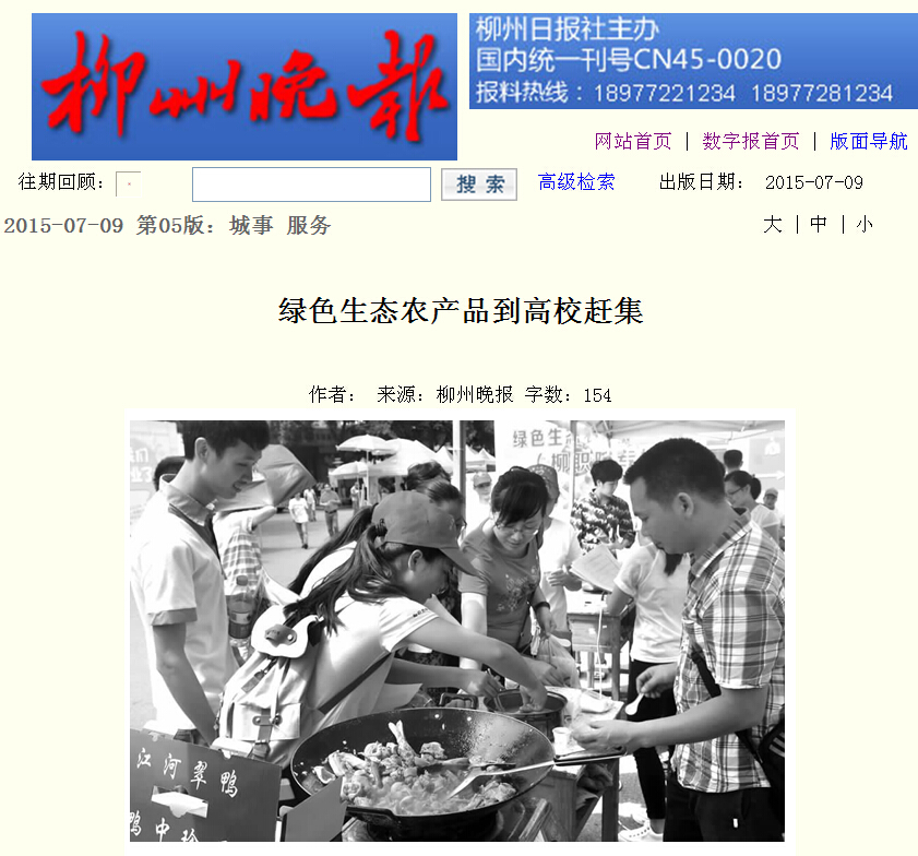 柳州晚报刊发我院举办农产品品尝会的新闻 来源:柳州职业技术学院新闻网 作者:石玉丹 编审: 发布时间:2015-07-13 浏览次数: 次 【字体:小 大】 分享到: 2015年7月9日,柳州晚报在第五版,以“绿色生态农产品到高校赶集”为题,刊发我院举办农产品品尝会的新闻。(截图:石玉丹) 关闭 打印正文