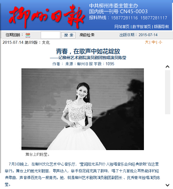 柳州日报刊发我院学生成长成才的新闻 来源:柳州职业技术学院新闻网 作者:石玉丹 编审: 发布时间:2015-07-26 浏览次数: 次 【字体:小 大】 分享到: 2015年7月14日,柳州日报在第9版,以“青春,在歌声中如花绽放”为题,刊发我院艺术设计系学生陈莹成长成才的新闻。(截图:石玉丹) 关闭 打印正文
