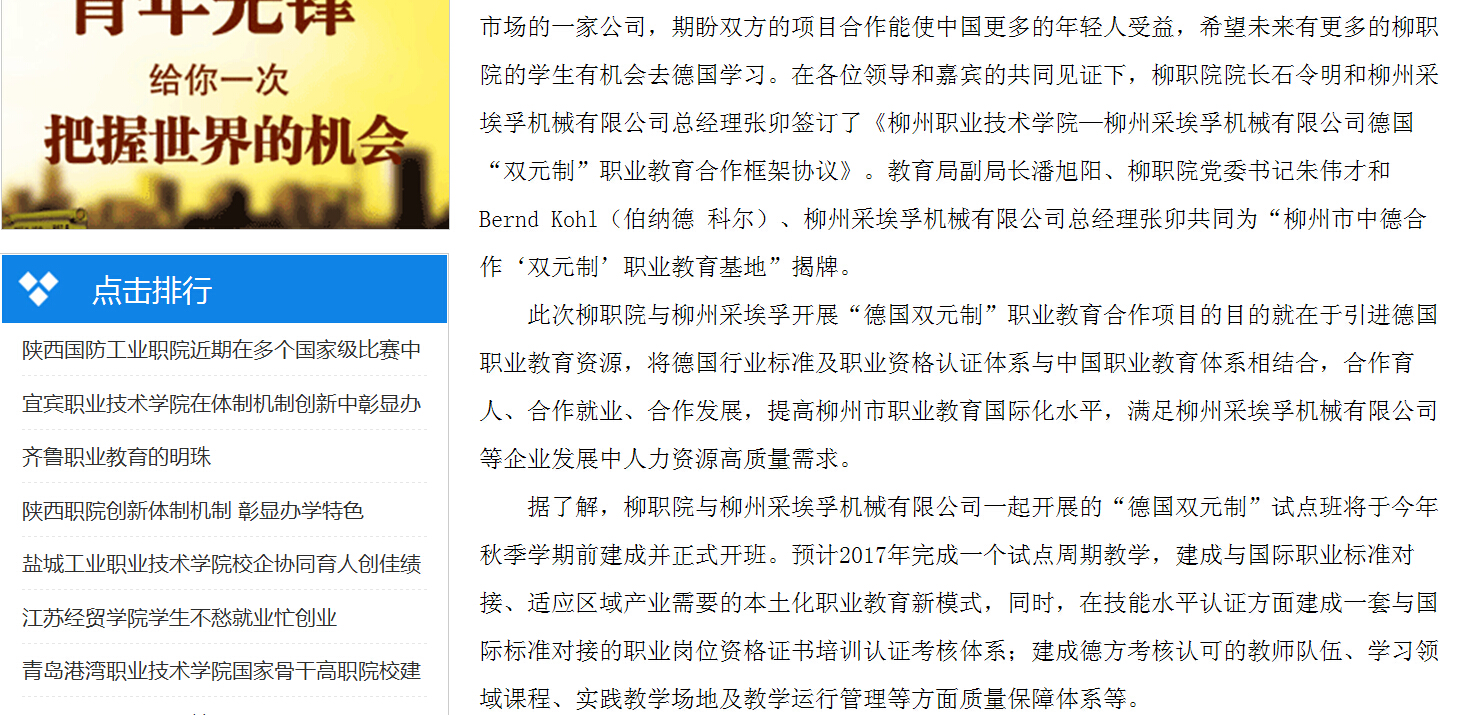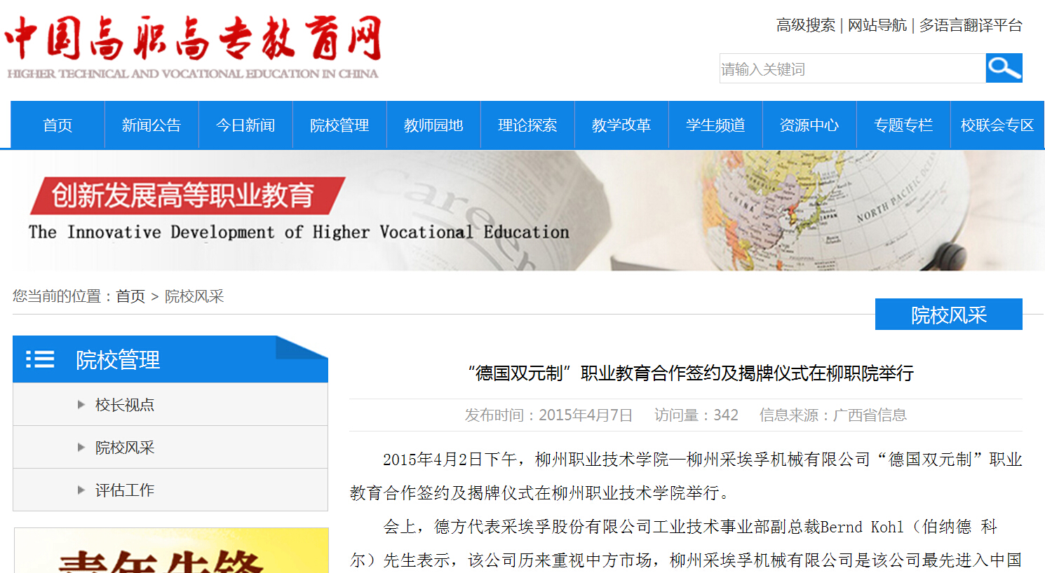 2015年4月7日,中国高职高专网发布“德国双元制”职业教育合作签约及揭牌仪式在我院举行的信息。(崔智慧)