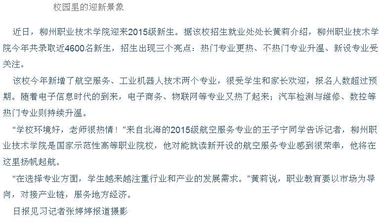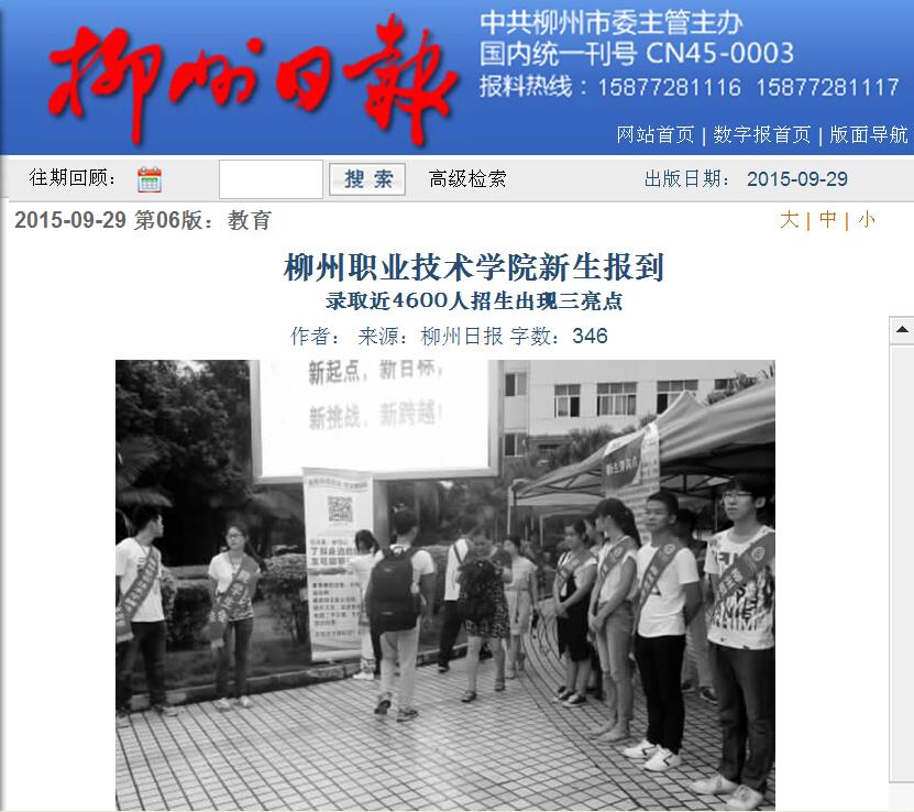 柳州日报近日刊发我院新生报到的新闻 来源:柳州职业技术学院新闻网 作者:石玉丹 编审: 发布时间:2015-09-29 浏览次数: 次 【字体:小 大】 分享到: 2015年9月29日,柳州日报在第六版,以“柳州职业技术学院新生报到”为题,报到我院新生到校的新闻。(截图:石玉丹) 关闭 打印正文