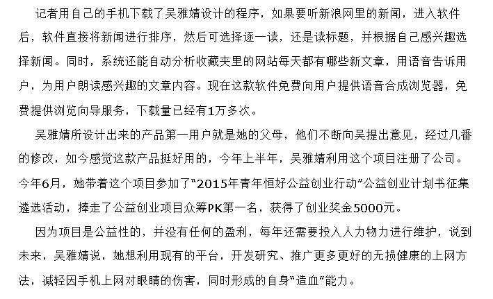 南国今报近日刊发我院大学生开展软件开发的新闻 来源:柳州职业技术学院新闻网 作者:石玉丹 编审: 发布时间:2015-10-13 浏览次数: 次 【字体:小 大】 分享到: 2015年10月10日,南国今报在第6版以“柳州大学生开发‘听手机’软件”刊发我院大学生吴雅婧开展软件开发的新闻。(截图:石玉丹) 关闭 打印正文