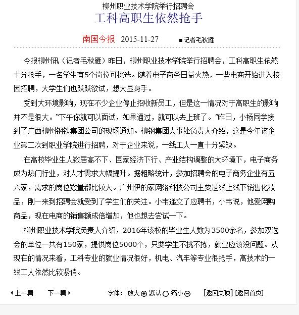 南国今报刊发我院举办双选会的新闻 来源:柳州职业技术学院新闻网 作者:石玉丹 编审: 发布时间:2015-11-30 浏览次数: 次 【字体:小 大】 分享到: 2015年11月27日,南国今报在第3版,以“工科高职生依然抢手”为题,刊发我院举办双选会的新闻。(截图 石玉丹) 关闭 打印正文