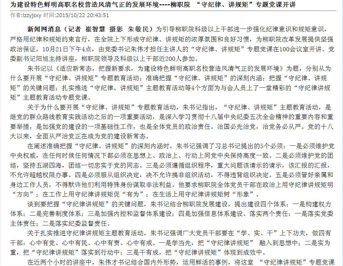 柳州教育局网站发布我院 “守纪律、讲规矩”专题党课开讲的信息 来源:柳州职业技术学院新闻网 作者:崔智慧 编审: 发布时间:2015-11-30 浏览次数: 次 【字体:小 大】 分享到: 10月29日,柳州教育局网站发布我院 “守纪律、讲规矩”专题党课开讲的信息。(崔智慧) 关闭 打印正文