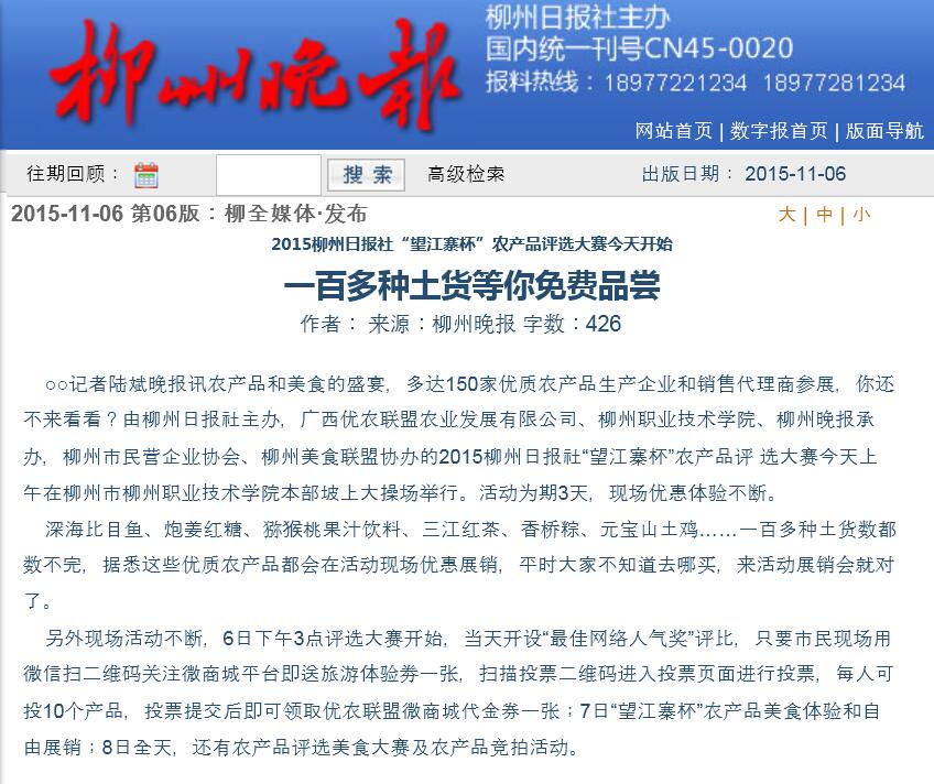 柳州晚报刊发我院承办农产品评选大赛的新闻 来源:柳州职业技术学院新闻网 作者:石玉丹 编审: 发布时间:2015-12-01 浏览次数: 次 【字体:小 大】 分享到: 2015年11月6日,柳州晚报在第6版,以“一百多种土货等你免费品尝”为题,刊发我院承办农产品评选大赛的新闻。(截图:石玉丹) 关闭 打印正文