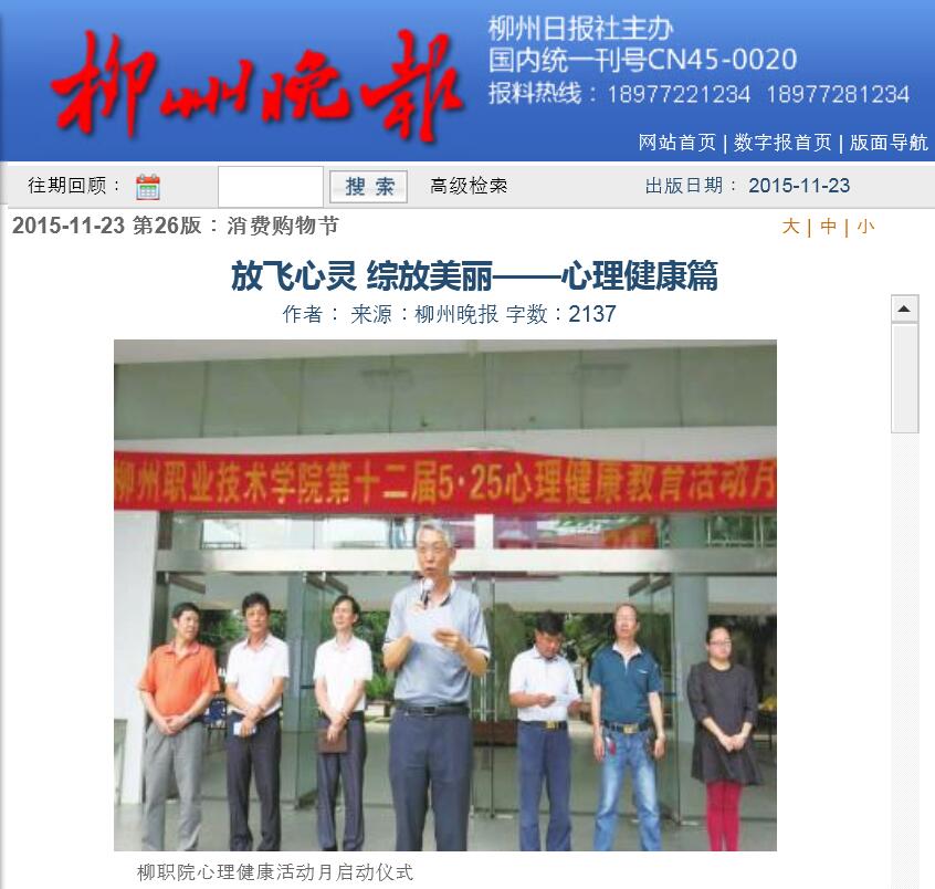 柳州晚报刊发我院以心理健康教育服务学生成长成才的新闻 来源:柳州职业技术学院新闻网 作者:石玉丹 编审: 发布时间:2015-12-01 浏览次数: 次 【字体:小 大】 分享到: 2015年11月23日,柳州晚报在第26版,以“放飞心灵 绽放美丽”为题,刊发我院以心理健康教育服务学生成长成才的新闻。(截图:石玉丹) 关闭 打印正文