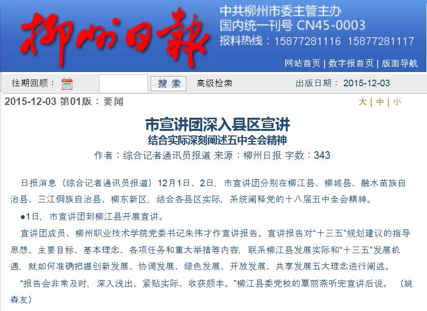 柳州日报刊发我院领导作宣讲报告的新闻 来源:柳州职业技术学院新闻网 作者:石玉丹 编审: 发布时间:2015-12-24 浏览次数: 次 【字体:小 大】 分享到: 2015年12月3日,柳州日报在第一版,以“市宣讲团深入县区宣讲”为题,刊发我院党委书记朱伟才作宣讲报告的新闻。(截图:石玉丹) 关闭 打印正文
