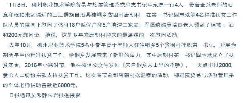 柳州日报刊发我院老师向三江农村捐款捐物的新闻 来源:柳州职业技术学院新闻网 作者:石玉丹 编审: 发布时间:2016-01-13 浏览次数: 次 【字体:小 大】 分享到: 2016年1月12日,柳州日报以“大山在呼唤 温暖送到家”为题,刊发我院老师向三江农村捐款捐物的新闻。(截图:石玉丹) 关闭 打印正文