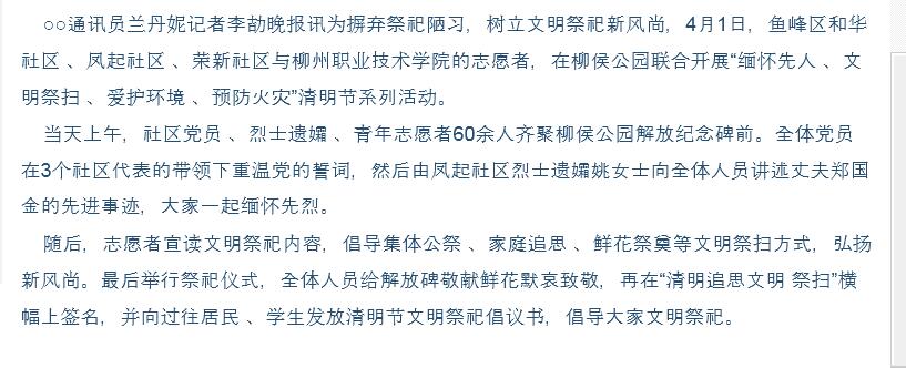 柳州晚报刊发我院大学生祭祀先烈的新闻 来源:柳州职业技术学院新闻网 作者:石玉丹 编审: 发布时间:2016-04-14 浏览次数: 次 【字体:小 大】 分享到: 2016年4月3日,柳州晚报在第3版,以“缅怀先烈 倡导文明祭祀”为题,刊发我院大学生清明时节到烈士陵园祭祀先烈的新闻。(截图:石玉丹) 关闭 打印正文