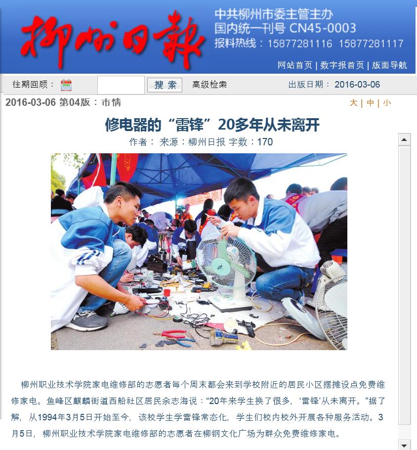 柳州日报近日刊发我院大学生志愿者开展社会服务的图片新闻 来源:柳州职业技术学院新闻网 作者:石玉丹 编审: 发布时间:2016-03-08 浏览次数: 次 【字体:小 大】 分享到: 2016年3月6日,柳州日报在第4版,以“修电器的‘雷锋’20多年从未离开”为题,刊发我院大学生志愿者开展社会服务的图片新闻。(截图:石玉丹) 关闭 打印正文
