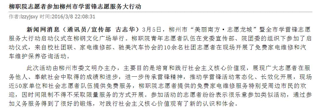柳州教育局网站发布我院志愿者参加柳州市学雷锋志愿服务大行动的信息 来源:柳州职业技术学院新闻网 作者:崔智慧 编审: 发布时间:2016-03-11 浏览次数: 次 【字体:小 大】 分享到: 2016年3月9日,柳州教育局网站发布我院志愿者参加柳州市学雷锋志愿服务大行动的信息。(截图 崔智慧) 关闭 打印正文