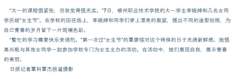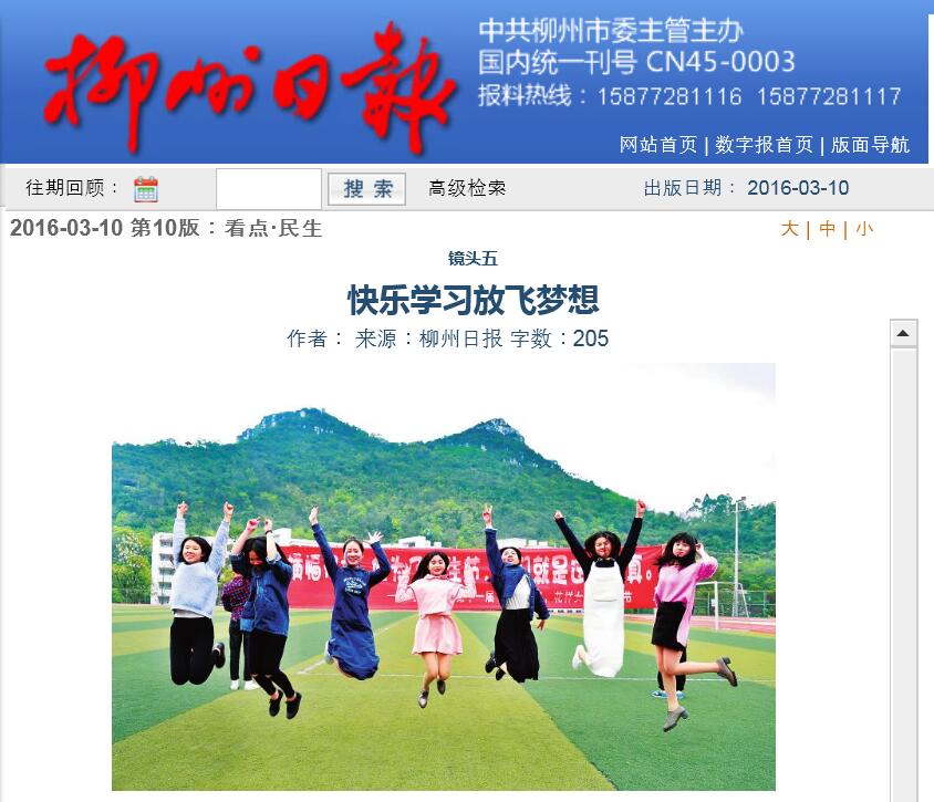 柳州日报刊发我院举办女生节的新闻 来源:柳州职业技术学院新闻网 作者:石玉丹 编审: 发布时间:2016-03-25 浏览次数: 次 【字体:小 大】 分享到: 2016年3月10日,柳州日报在第10版,以“快乐学习放飞梦想”为题,刊发我院举办女生节的新闻。(截图:石玉丹) 关闭 打印正文