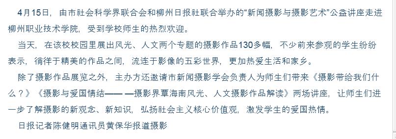 柳州日报刊发“新闻摄影与摄影艺术”公益讲座走进我院的新闻 来源:柳州职业技术学院新闻网 作者:石玉丹 编审: 发布时间:2016-04-20 浏览次数: 次 【字体:小 大】 分享到: 2016年4月17日,柳州日报在第4版、以“师生爱摄影 行家来传经”为题,刊发新闻摄影与摄影艺术”公益讲座走进我院的新闻。(截图:石玉丹) 关闭 打印正文