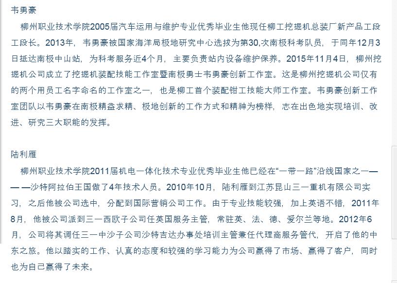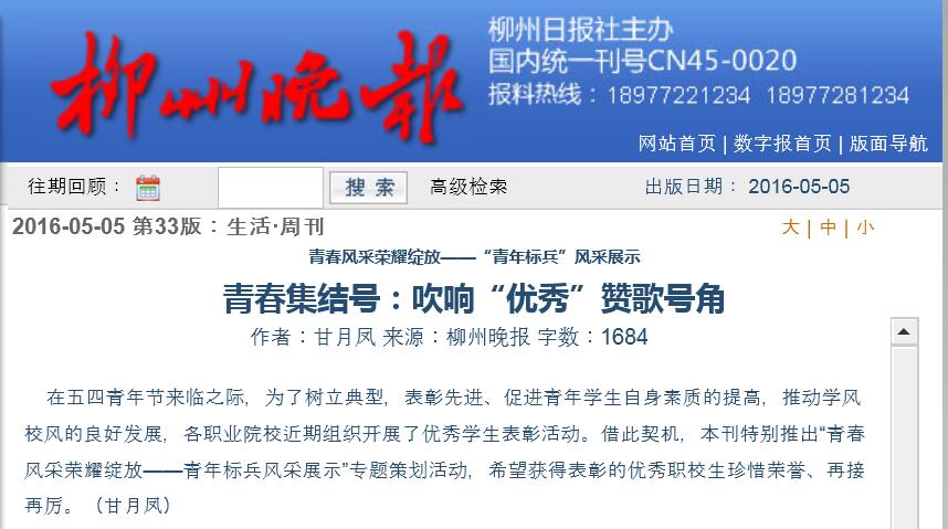 柳州晚报近日刊发我院两位优秀毕业生的事迹 来源:柳州职业技术学院新闻网 作者:石玉丹 编审: 发布时间:2016-05-05 浏览次数: 次 【字体:小 大】 分享到: 2016年5月5日,柳州晚报在第33版,以“吹响‘优秀’赞歌号角”为题,刊发我院两位优秀校友的事迹。(截图:石玉丹) 关闭 打印正文