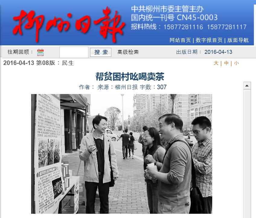 柳州日报刊发我院教师为贫困村茶叶找销路的新闻 来源:柳州职业技术学院新闻网 作者:石玉丹 编审: 发布时间:2016-05-10 浏览次数: 次 【字体:小 大】 分享到: 2016年4月13日,柳州日报在第8版,以“帮贫困村吆喝卖茶”为题,刊发我院教师为贫困村的茶叶找销路的新闻。(截图:石玉丹) 关闭 打印正文