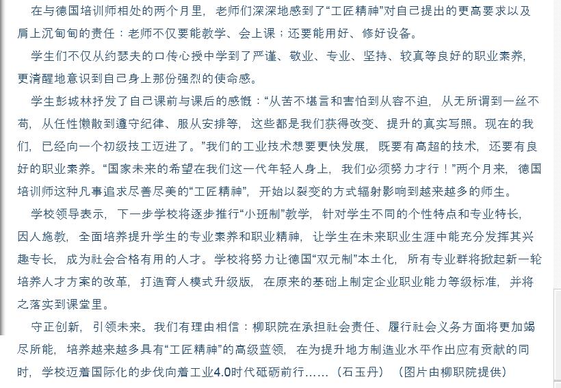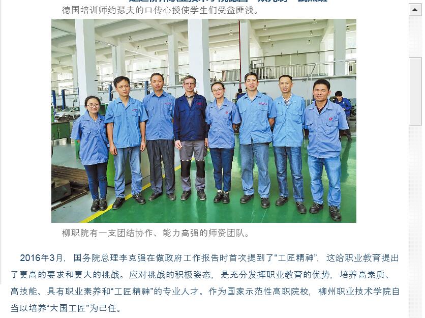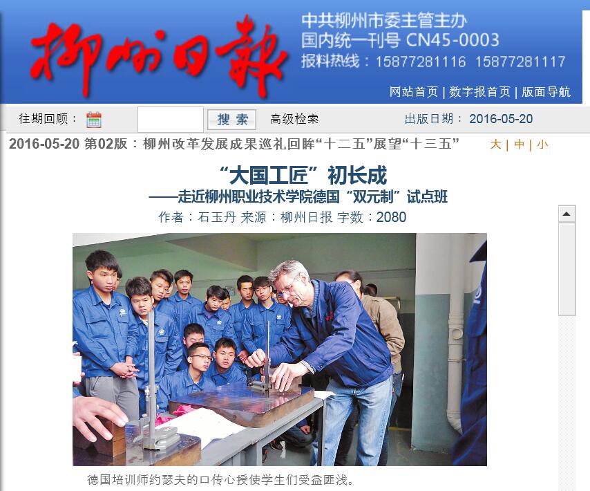 2016年5月20日,柳州日报在第2版,以“‘大国工匠’初长成”为题,刊发德国培训师约瑟夫到我院给“双元制”试点班35名学生实施两个月《用普通机床加工零部件》课程的专题新闻。(截图:石玉丹)